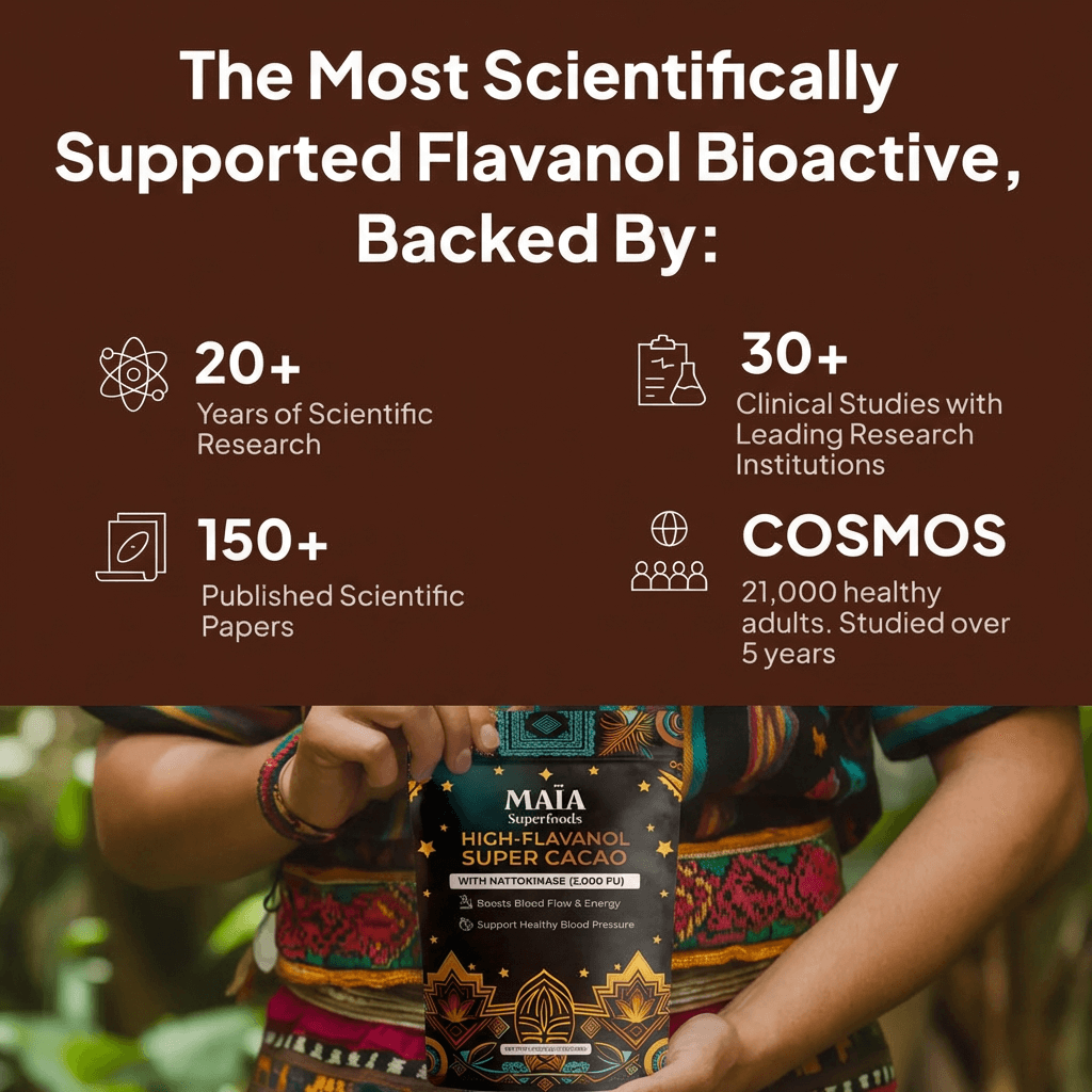 Our cacao features the same flavanol levels used in the COSMOS study, where over 21,000 participants saw significant improvements in cardiovascular health outcomes including blood pressure support. Every serving of MAÏA is clinically proven to support healthy blood pressure levels within 2 hours.